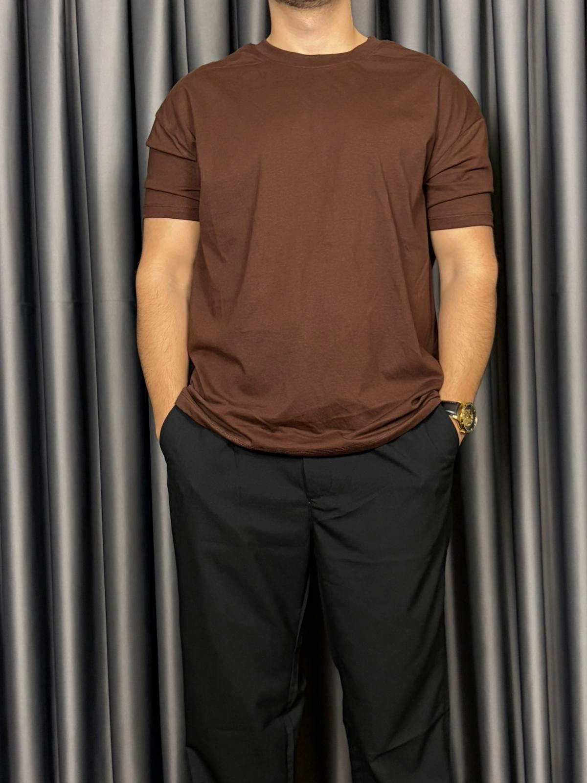 Basic Kollar Dar Kesim Tshirt - Kahverengi