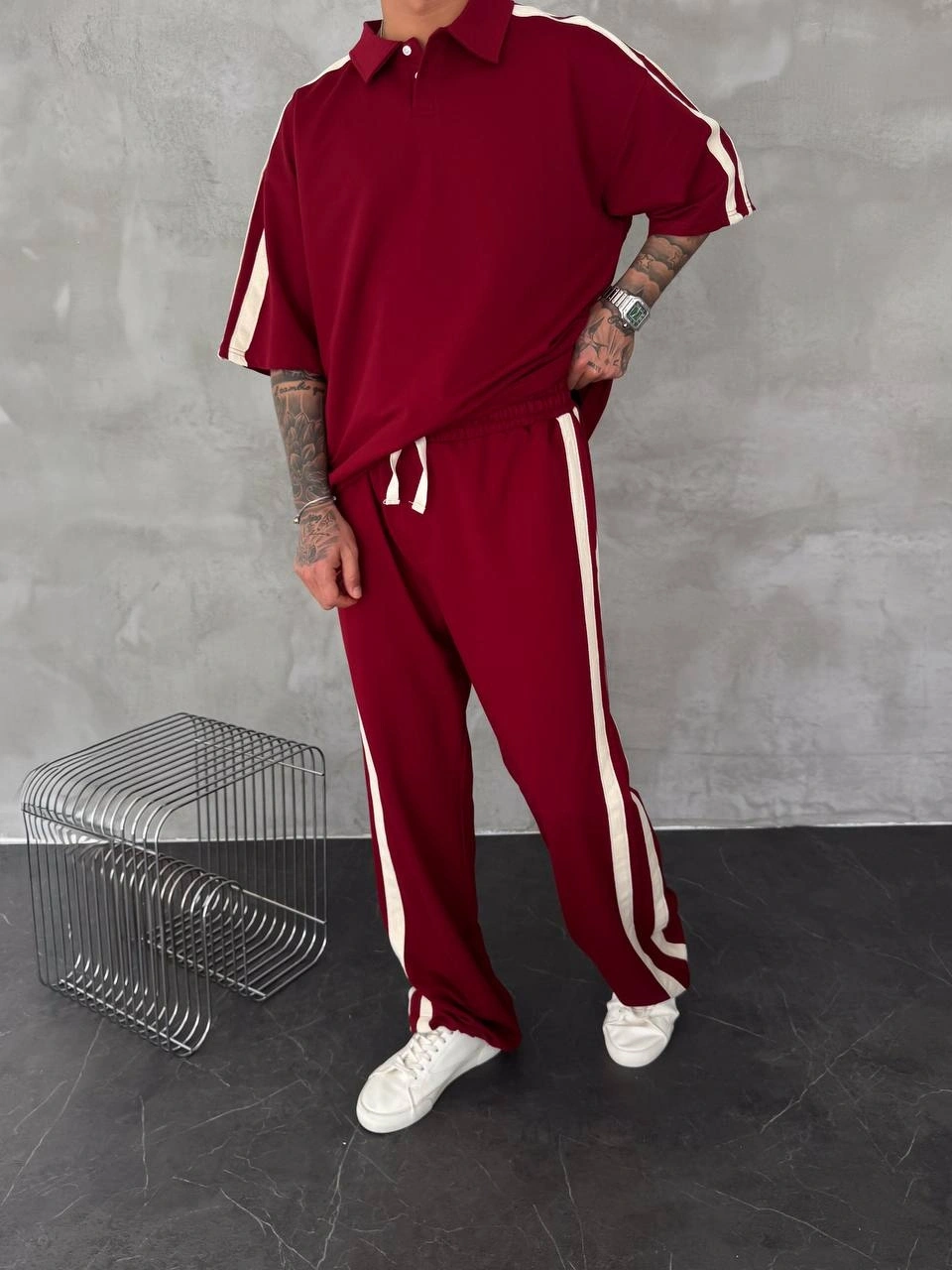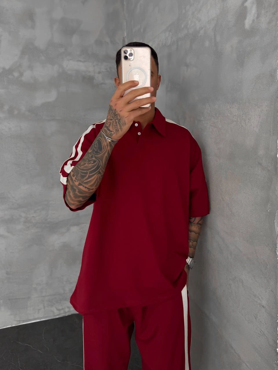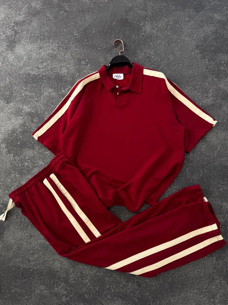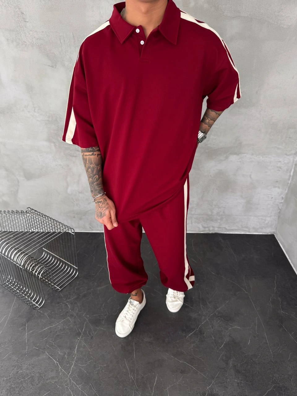 POLO YAKA ŞERİT DETAY BAGGY RAHAT KALIP EŞOFMAN TAKIM -KIRMIZI